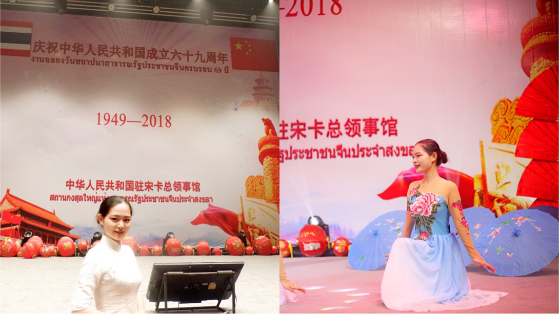 十个月的任期是忙碌的,作为泰南艺术团的成员,我们常受到当地大型文艺活动的邀请。对于肢体不协调的我来说,是痛苦的也是快乐的。我把排练的日子称为“黑色星期五”,我们要在舞蹈室集体排练到晚上八点,而接下来的一整周我都需要自己单独练习,才能在下次排练时跟上大家的动作。但我也很幸运,不需要经历“台下十年功”的心酸,就能拥有为领事馆、侨胞表演的机会。我也可以大声地说出,我此生最自豪的经历之一就是参加了“庆祝中华人民共和国成立六十九周年”的活动,《歌唱祖国》的音乐响起时,全场的侨胞们都昂首挺胸,饱含深情地歌唱。我明白了“同根同源、血脉相承”的民族感、历史感并不会因为地域、时间的改变而改变。