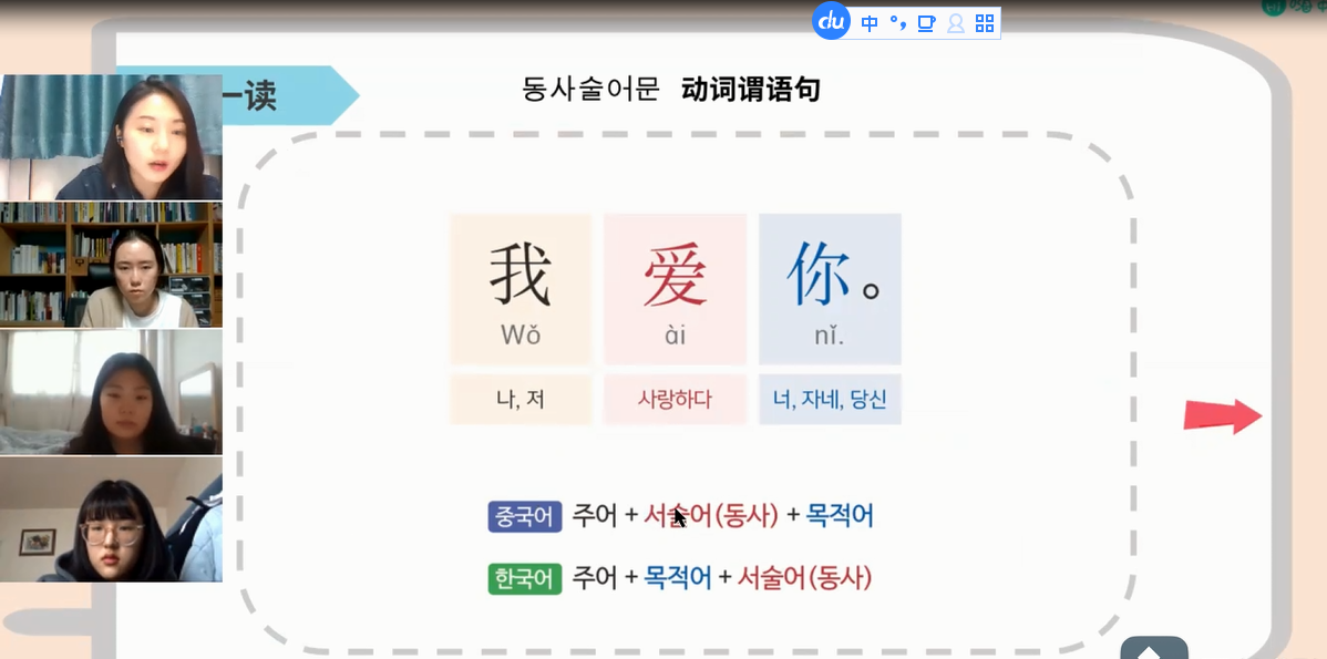 有了第一次的突破,在今年2月的时候我又报名参加了学校组织的为韩国蔚山大学零基础汉语学习者进行线上练习辅导的实习项目。这回我辅导的是五位韩国大学生,他们都是汉语零基础的学习者,因为我不会韩语,所以我们用英语进行简单的沟通,主要以PPT的内容为主,因为PPT中有韩文的翻译,当然也配备了韩国的助教老师,帮助我们解决课堂上可能出现的语言不通的问题。这次教学非常系统,因为不同于一对一,上课相对会更加正规和严肃化,每节课都要提前看教案以及上课所使用的PPT,最主要的是对Zoom的操作也要求的更高。每节课的时间需要严格把控,要在规定的时间内把所准备的知识教给学生,同时也要考虑如何让学生能够更有效率的学会这些知识,并做到有效的输出。