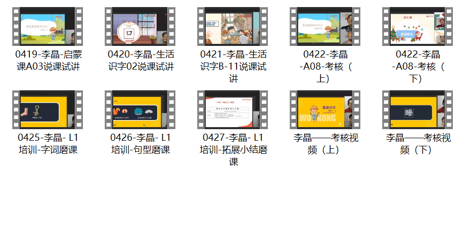 悟空中文的培训和考核体系是相当完善的,针对不同年龄段和学情的教学对象有明确的培训目标及方案,涵盖教姿教态、教学目标、课堂管理、引导互动、趣味教学等多个方面。每天的任务一般由三部分组成,第一部分是观看录播视频及完成测试卷,录播视频一般包含课程说明、少儿中文学习理念、家长沟通等;第二部分一般是生字、词语、课文、文化拓展等切片教学,包含优秀老师Demo课堂观摩学习;第三部分是直播磨课,内训师会对我们的试讲进行专业点评并给出建议。每天直播磨课结束后,需要提交自己的磨课视频(如下图)。