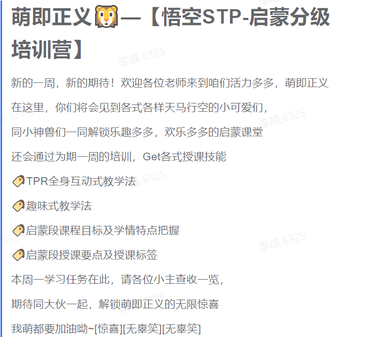 考核结果在第二天下午就出了,我通过了,有HR老师来与我沟通上课时间,说目前排课的高峰期是凌晨00:00-04:00以及早上6:00-8:00,虽然我很担心后面接到的学生数量,但还是拒绝了,因为在宿舍上课,选择的时间绝不能与室友的作息时间冲突。她又问我会日语吗,日本与我们只差一个时区,所以学生的上课作息时间与我们是非常吻合的。我有点跃跃欲试,想着反正自己正在学习日语,这样能一举两得,那不是很好吗。但深思熟虑之后还是放弃了,最好还是不要为自己的教学增加负担了,我的日语是初级水平,无障碍的口语交际基本做不到。就这样,我提交了自己的可排课时间,进入了为期两周的L系列启蒙阶段和L1阶段的培训。启蒙阶段培训目标如下图:
