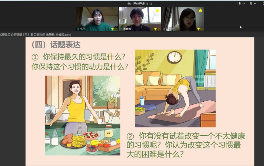 每个话题的检索筛除,维持对谈线索的提问设计,话轮转变时背景图片应涵的信息量,成段语篇的关联词提示……为了实现“即使我不介绍这一页PPT,学生也能从课堂线索、背景图片的提示中联想到自己可以发言的内容”的目标,第二周口语课我不得不绞尽脑汁地设想“教师沉默时”的种种可能,并且尽可能根据学生第一堂课表现出的深浅不一的特点,力求学生能够在实现主动的语言产出的同时,融入到课堂氛围中。