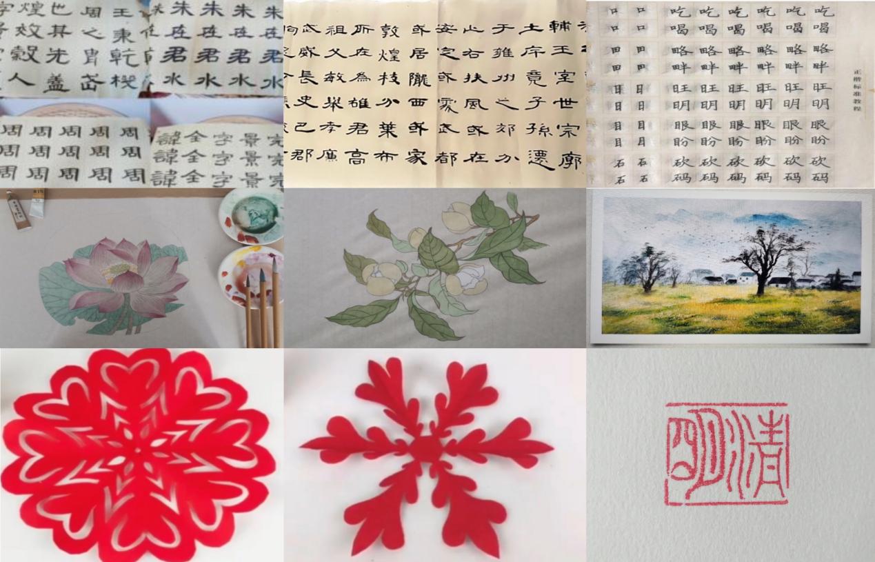 篆刻、剪纸、中国舞、书法、民族乐器、茶艺、民歌、中国画等,假期中,同学们通过自学或寻找专业老师指导的方式,练习各种中华才艺。在学习才艺的过程中,同学们更深入地了解了中华传统文化,预先为今后更好地向世界传播中华文化做准备。