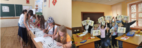 当时与我一同前去的还有浙江师范大学的4名志愿者,在了解了每个人的专业背景后,我被安排去带幼儿初级班。总共两个班,小小班是零基础3-5岁的孩子,小班是有一年学龄的5-8岁孩子。因为从未想过自己的教学对象会是小孩子,所以,接到任务的那一刻内心很是不安,第一次怀着忐忑不安的心情走进教室,才发现,每位小朋友都有一名家长陪伴(主要是奶奶或者妈妈),当我用俄语做完自我介绍后,教室立刻活跃起来。因为有家长协助,所以,小朋友们不但不会乱跑,还全程积极参与互动,整个教学活动进行的非常顺利。为了调动小朋友们的积极性,我总是会花很多时间去备课,根据课程内容设计各种有趣的游戏、比赛,教他们唱中文歌、剪纸、包饺子、拉拉面……就这样,我们的教室里总是充满欢声笑语,我也成了孔院“最幸福的老师”。课间,孩子们在玩闹,家长们总是围着我嘘寒问暖,冬天刚到,暖暖的手套、围巾就已悄悄地摆在桌了上。教师节,孩子们送来了亲手做的贺卡;春节,有位奶奶还特意为我包了红包……